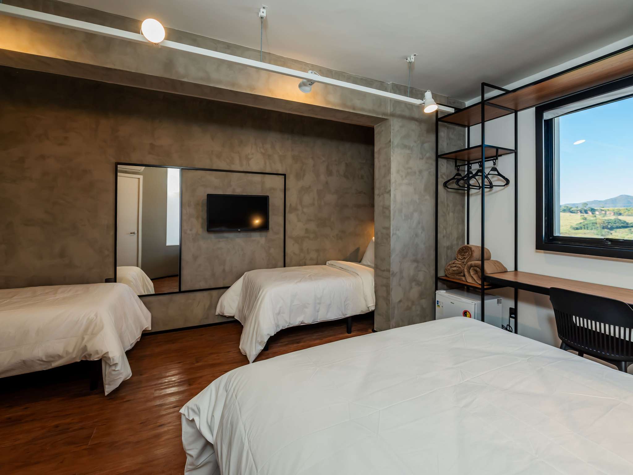 Moderno e convidativo o apartamento ibis tem tudo o que sua família precisa para relaxar, 01 cama de casal e 02 camas solteiro padrão Sweet Bed com um banheiro confortavel e com decorações clean, tendo também uma Smart Tv e internet Wi-fi.